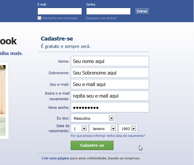 Bom para começar este artigo primeiro eu quero fazer algumas pergunta. Você tem Facebook? Se ainda não tem, tá esperando o que para criar o seu? As razões para eu fazer essas perguntas é muito simples, conversando com alguns amigos perguntei se eles tinham Facebook e para minha surpresa eles disseram que não. Não vejo mais graça em ficar no Orkut esperando alguém mandar um recado, é mil vezes melhor ficar compartilhando, curtindo e até cutucando os outros no Facebook, por isso se você é daqueles que ainda não tem um perfil no Facebook, veja esse artigo até o final que vou estar ensinando como criar um perfil, e ai é só sair curtindo.
