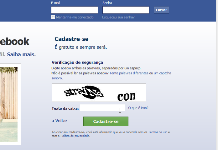 No segundo passo digite o texto corretamente e clique em Cadastre-se.