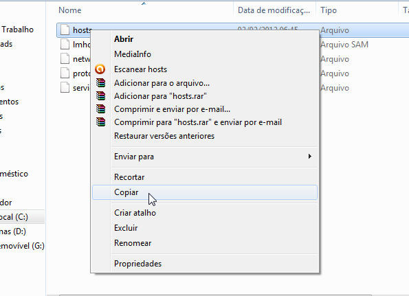 11º- Depois de salvo vamos devolver o documento alterado a pasta etc. Recorte o arquivo hosts alterado.