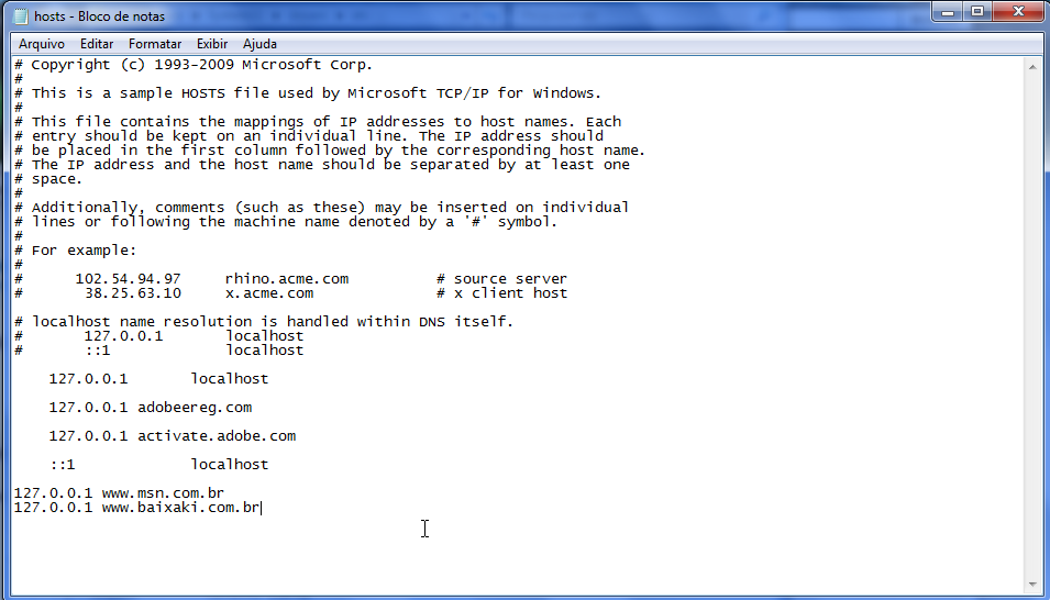 Você deve copiar o código acima e colocar no final do texto como na imagem abaixo, você pode bloquear quantos sites quiser basta apenas colocar o número de Ip na frente do endereço do site.