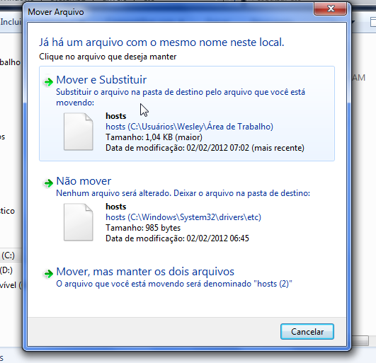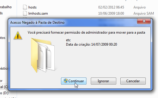 12º- Volte a pasta etc e cole o arquivo alterado hosts. Vai aparecer essa mensagem então clique em Mover e Substituir.