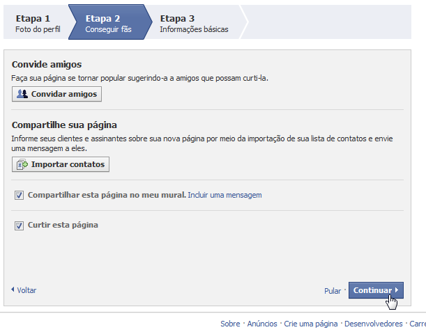 Aqui você pode convidar os seu amigos para Curtir a sua página, ou pode também enviar um convite para os amigos do Msn, Hotmail, Yahoo etc.. Depois clique em Continuar.