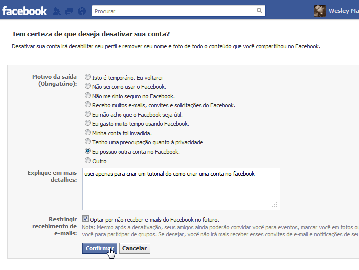 Agora você deve escolher um motivo pelo qual está desativado a conta, você deve também explicar com alguns detalhes.