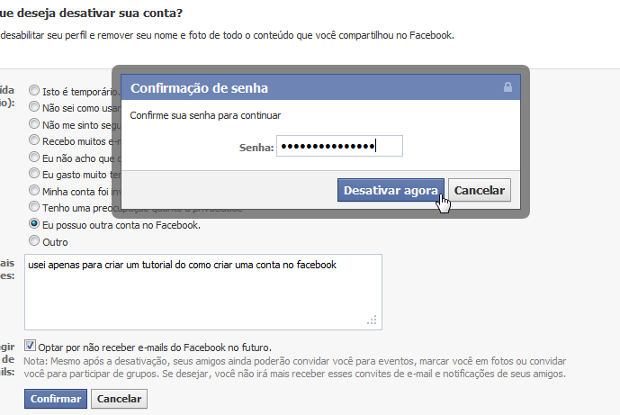 Agora digite sua senha de acesso do facebook e clique em Desativar agora.