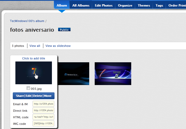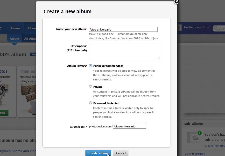 Aqui você deve escolher um nome para seu album em Name your new album, se você quiser escolher também se seu album será publico ou privado, essas é uma das vantagens do Photobucket sobre outros sites de armazenamento, pois escolhendo privado " Private " ninguém mais pode ver suas fotos ,imagens, vídeos a não ser que tenha sua senha.