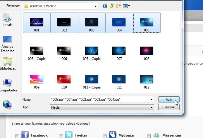 Escolha as imagens que deseja salva no Site, você pode escolher ao mesmo tempo quantas imagens quiser. Após escolher clique em Abrir e aguarde o carregamento das imagens.