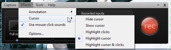 Agora vai aparecer essa barra de ferramentas no canto inferior direito, em Effects você pode configurar o Ponteiro do mouse e som do click, configurado do modo que está você terá um efeito de som ao clicar e o ponteiro do mouse com um destaque amarelo em volta para facilitar a visão de quen estiver assistindo.