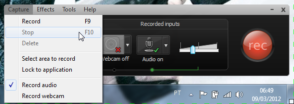 Para iniciar a gravação basta clicar em Rec, lembre também de ajustar o volume da gravação na barrinha ao lado de Audio.